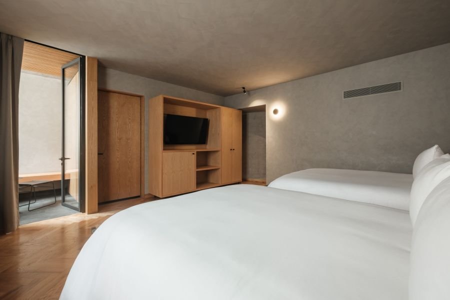 This room accommodates up to four guests with two queen-size beds, dressed in soft linens and set within a space filled with natural light. Step out onto your private terrace, an intimate spot to enjoy coffee in the morning or unwind after exploring the city. The room also features a desk, making it ideal for those who want to balance work and leisure. A modern bathroom with fresh towels and amenities ensures a seamless stay. For entertainment and convenience, you’ll find a flat-screen TV, WiFi, and a coffee maker to start your mornings.