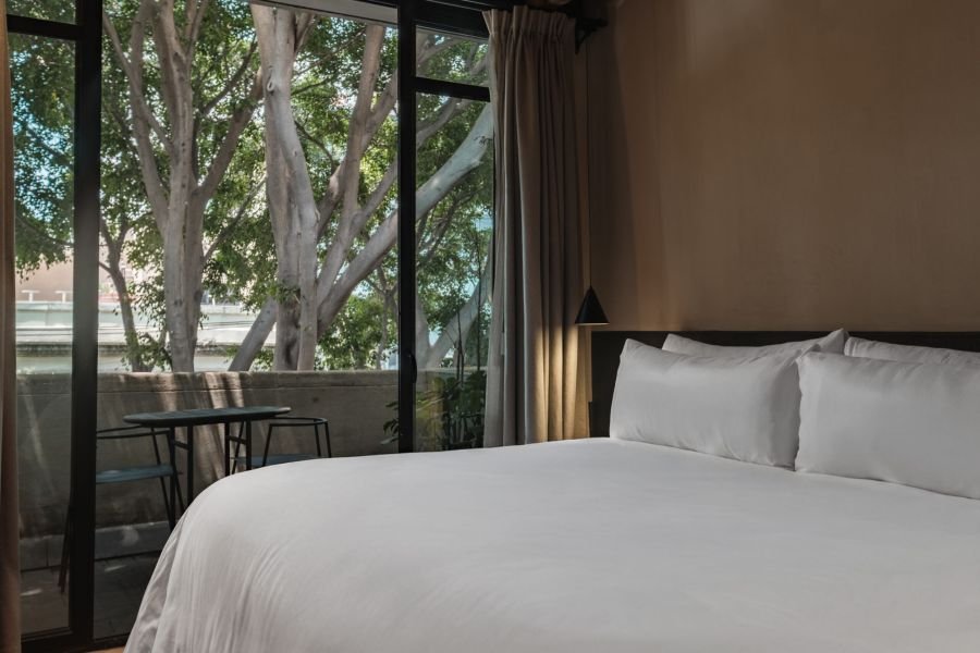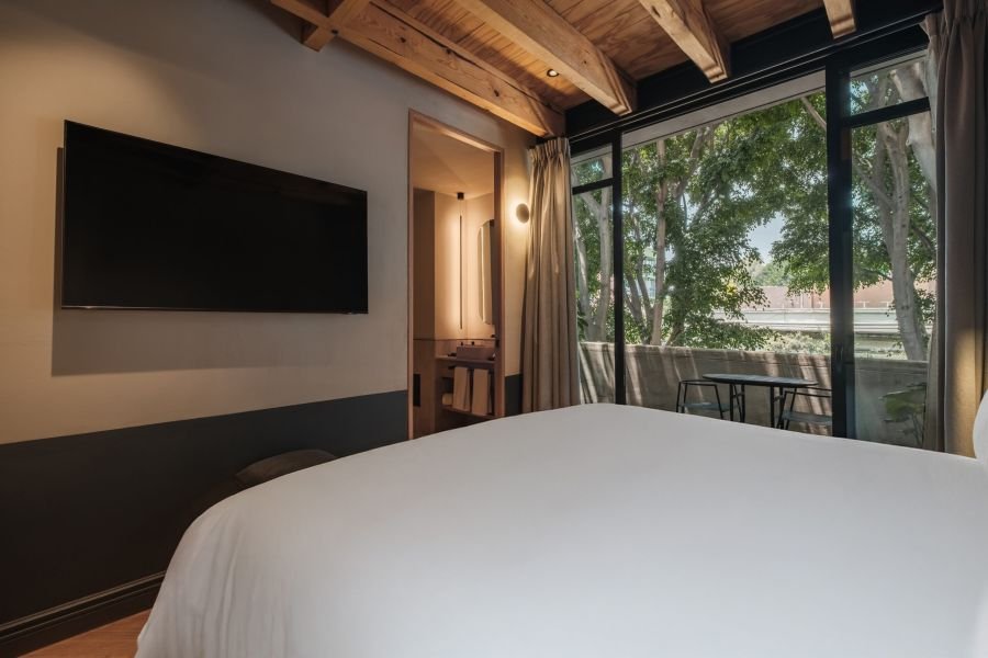 This room offers a separate bedroom with blackout drapes, premium linens, and a down comforter for restful sleep. Step outside to your private terrace and enjoy views of the city — perfect for a quiet morning coffee or an evening wind-down. Inside, you’ll find a sleek bathroom with fresh towels, daily housekeeping, and thoughtful amenities including a 55-inch smart TV, free high-speed WiFi, a safe, and a desk for added convenience.